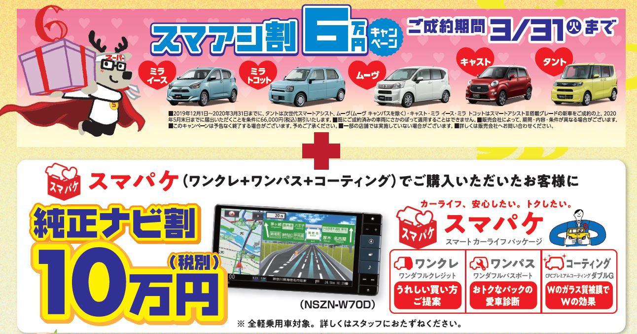 対象車種のスマートアシスト搭載車の新車をご成約のお客様に、6万円割引!ご成約期間3月31日(火)まで。
